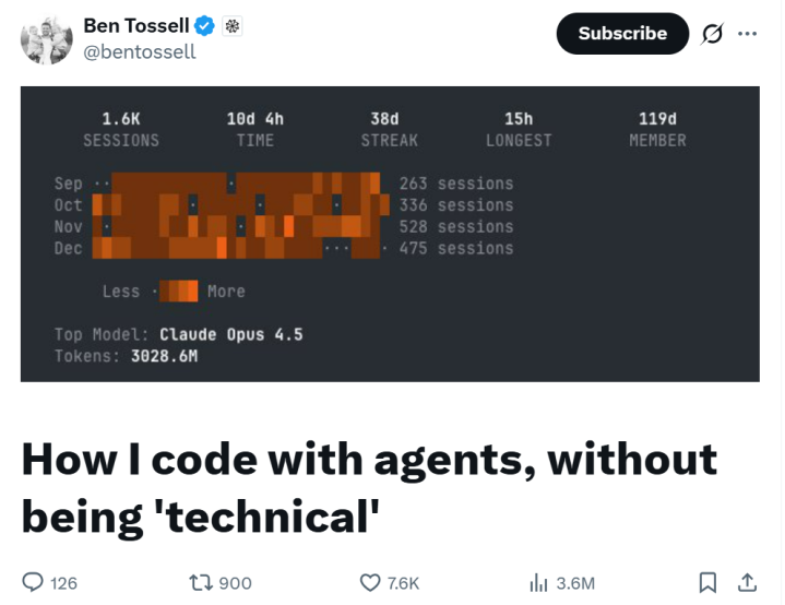 BenTossell(Factory开发者关系主管)就是其中一员。他是一位不怎么会写代码的人,在过去四个月里,却消耗了30亿个Token。