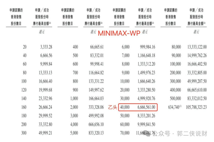 MiniMax的货量和壁仞科技非常接近,可以作为参考。壁仞有47.1万人申购,其中乙组2.9万人。MiniMax乙组按照1.2万人申购算,预估乙头中签6~8手。