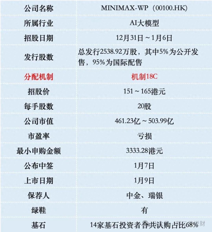 MiniMax本次IPO发行股份占全部股份比例的8.31%,按招股价上限165港元算,募资41.9亿港元,14名基石投资者锁定27.2亿,流通盘14.7亿。