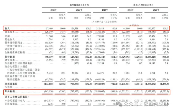 MiniMax的营收增长令人瞩目。2023年至2025年前三季度,公司收入从5740万人民币飙升至1.9亿人民币,2024年同比增长率高达782.2%。